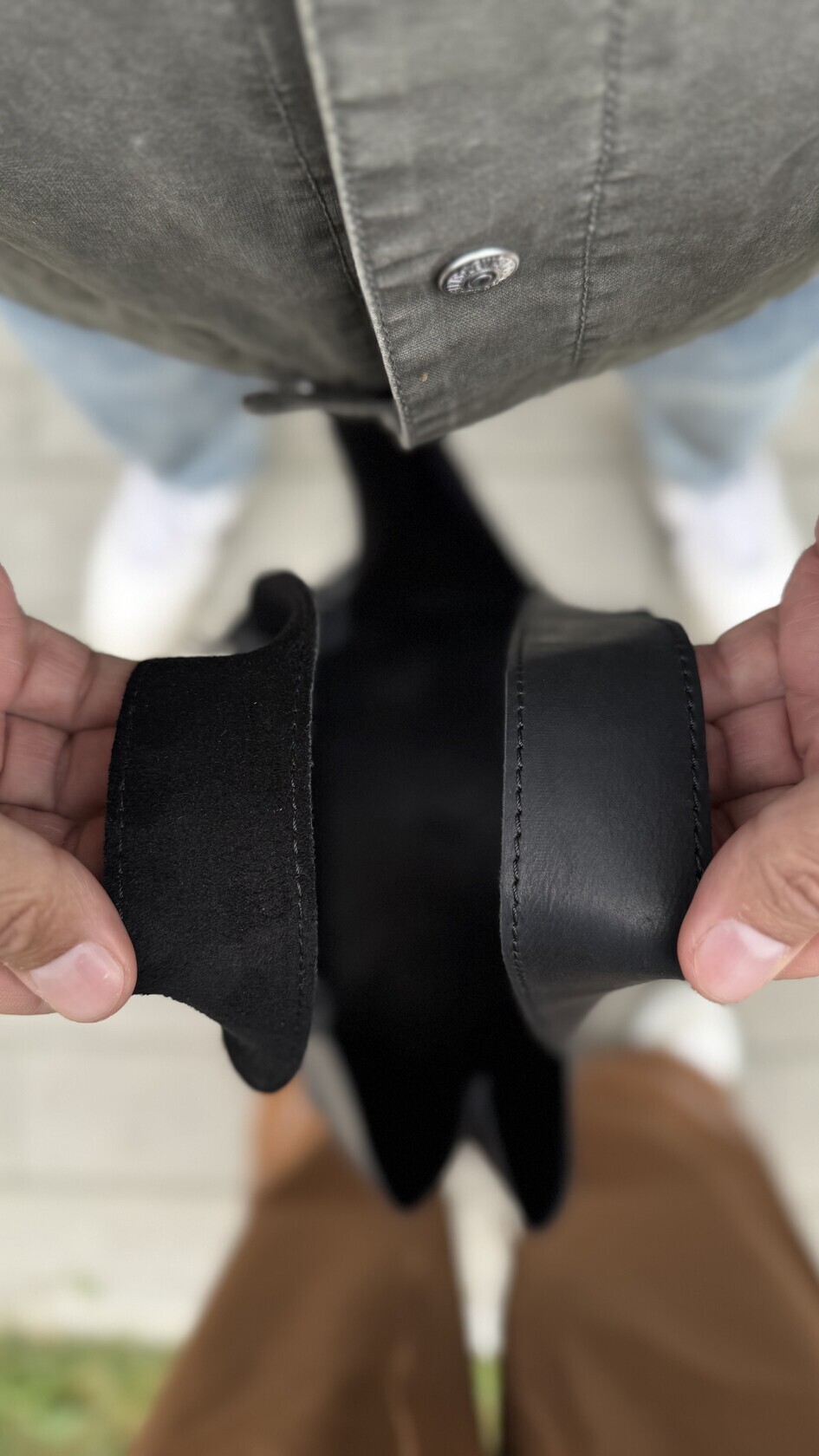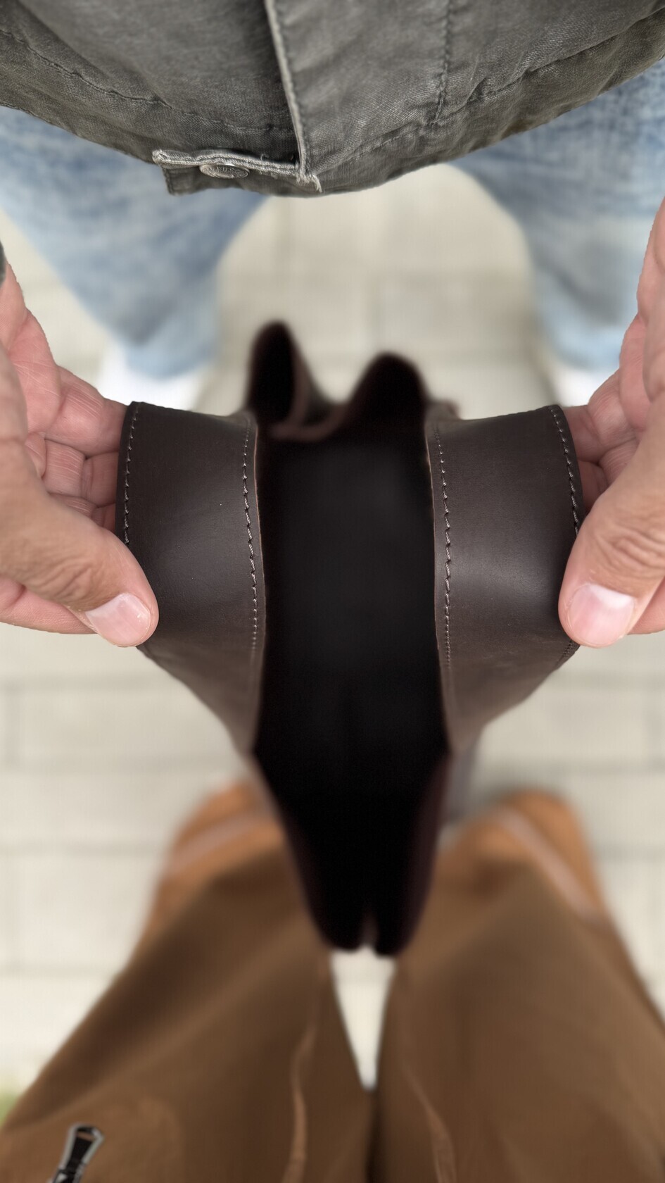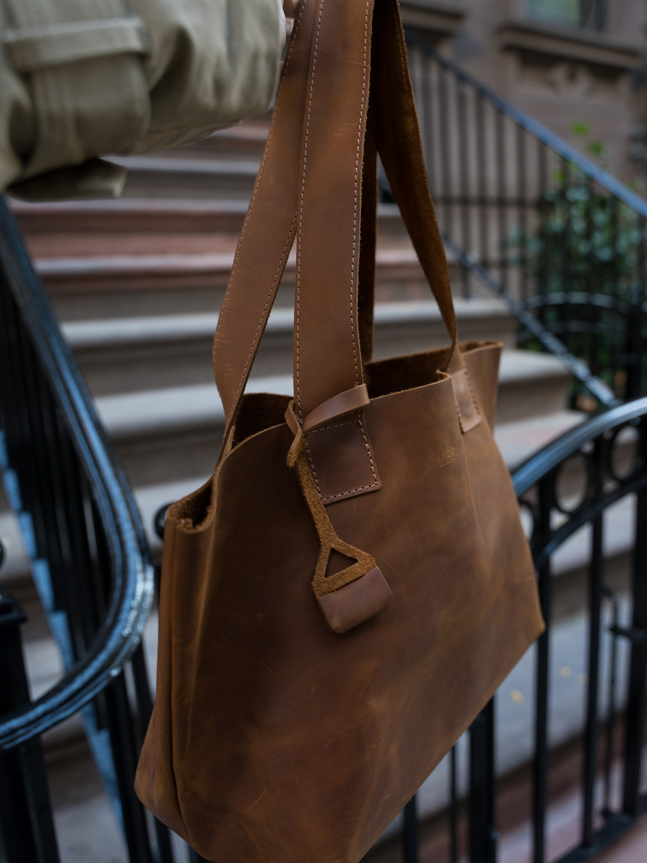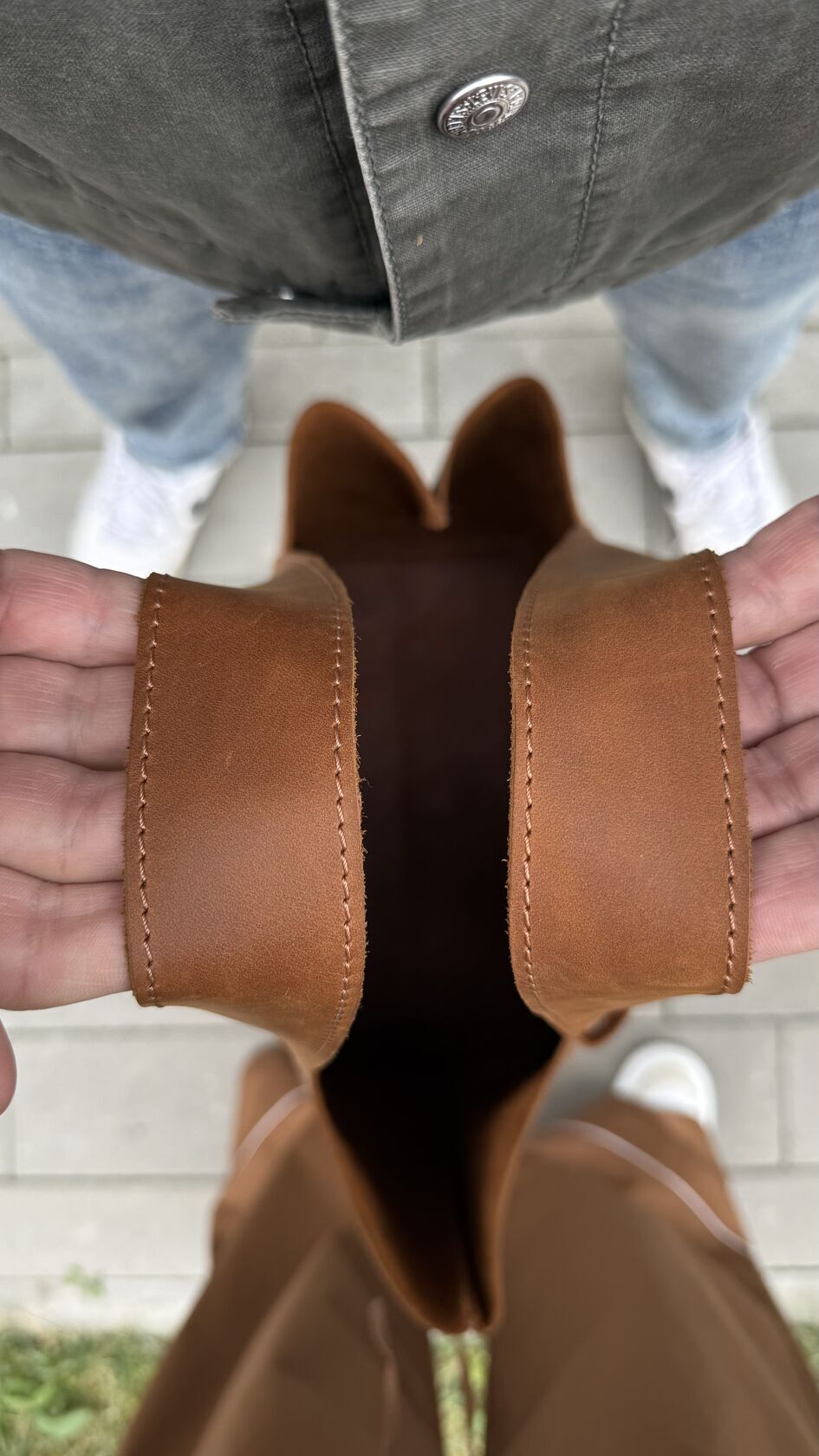 Шоппер прошит толстой коричневой итальянской полиэстровой нитью отличного качества с высокой прочностью на разрыв - не тянется, не линяет, не выцветает. Конструкция плотная и надёжная.
