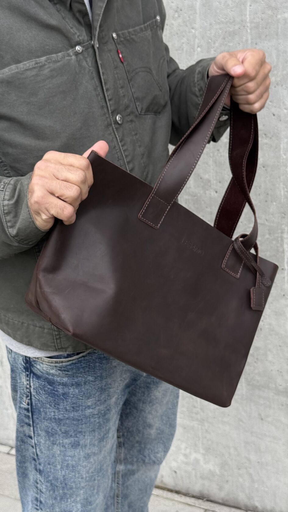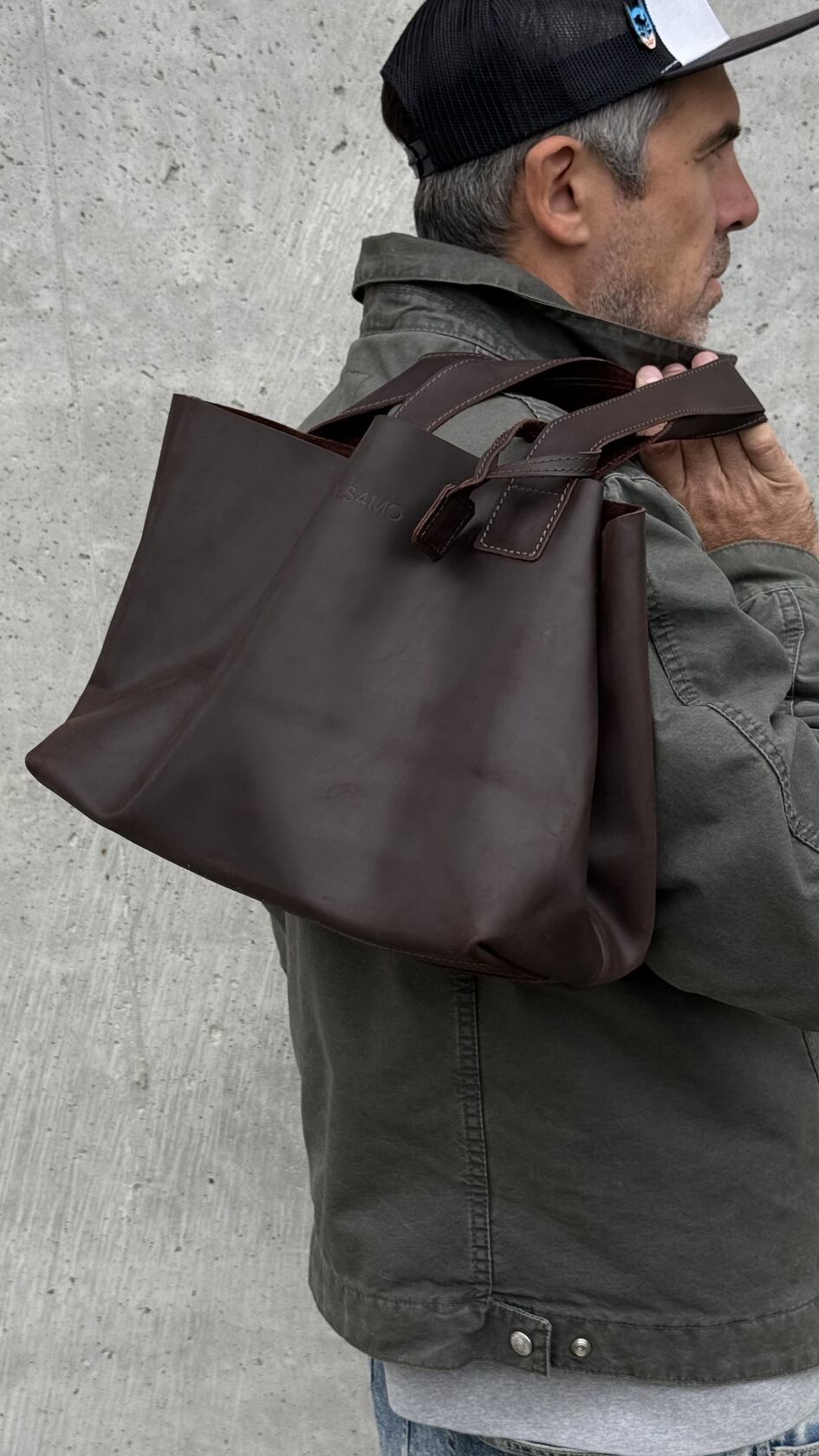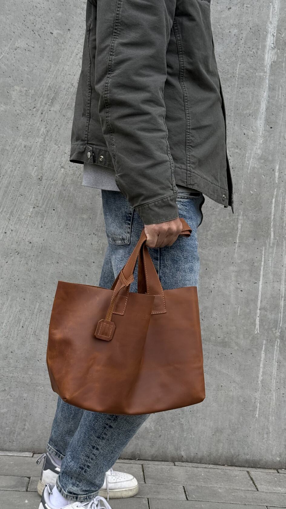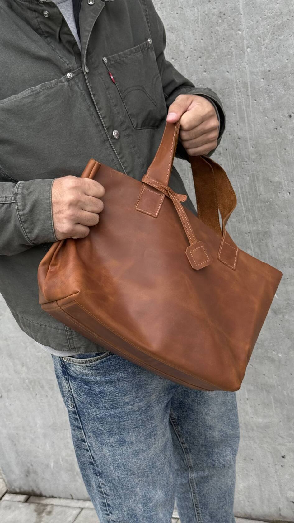 Ширина по верху 48 см, по низу 32 см, высота 25 см, глубина 17 см - кожаный шоппер достаточно большой и подойдет как для офиса, вместив документы A4 и 13" ноутбук, так и для похода в магазин, вместив и выдержав достаточно покупок, так и для небольшого путешествия или спортзала.