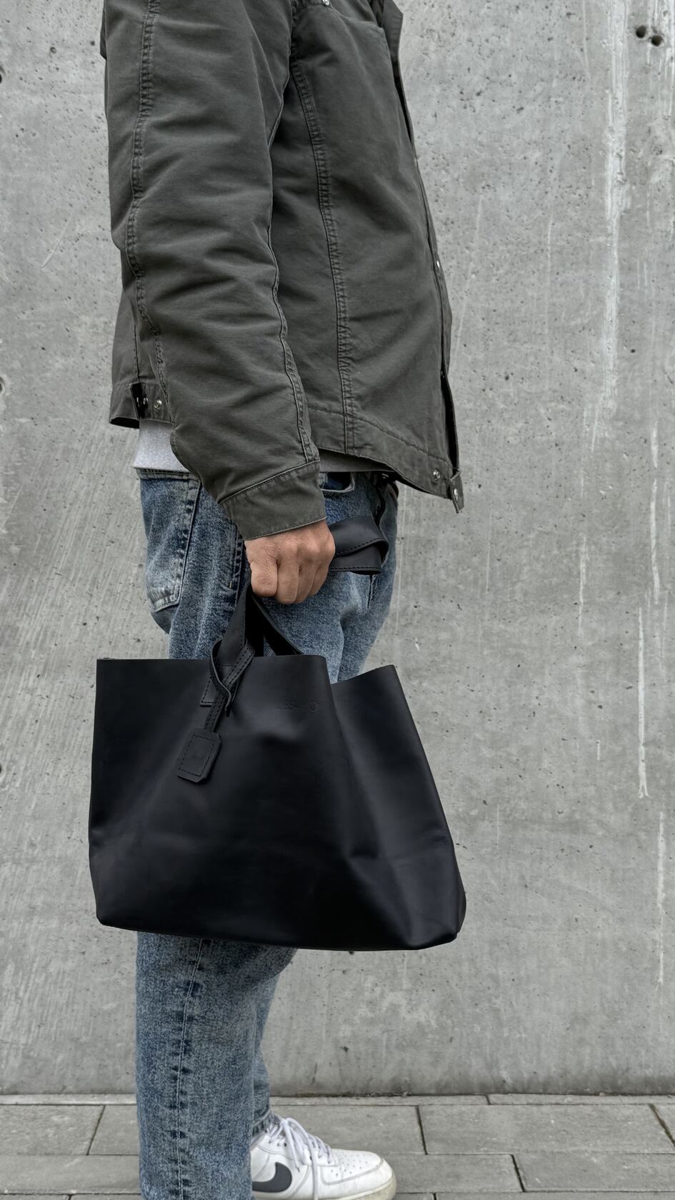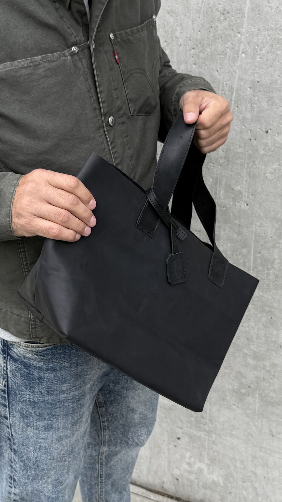 Сумка пошита из плотной черной натуральной кожи Крейзи Хорс 1-го сорта толщиной 1,4-1,6 мм качественной заводской выделки, которая используется производителями высококачественной галантерейной продукции, обуви и одежды премиального сегмента.