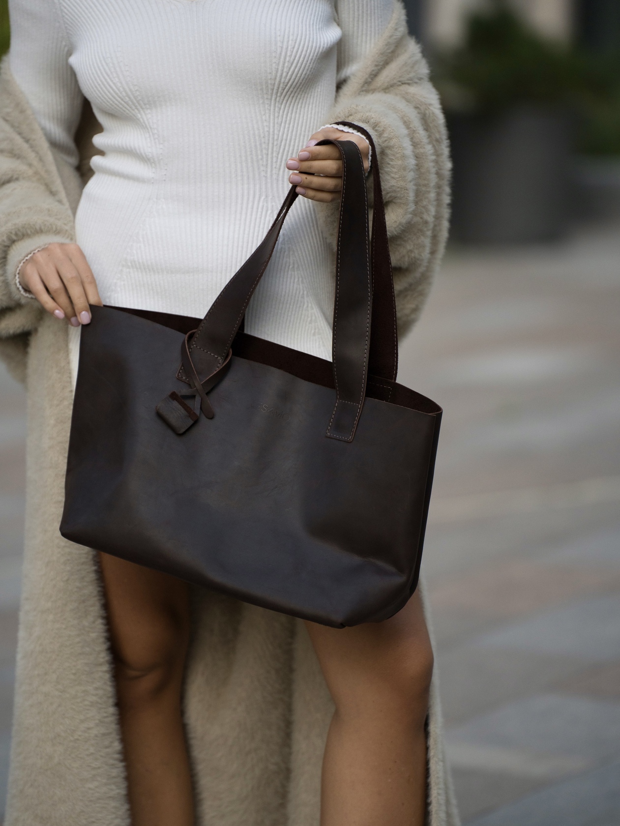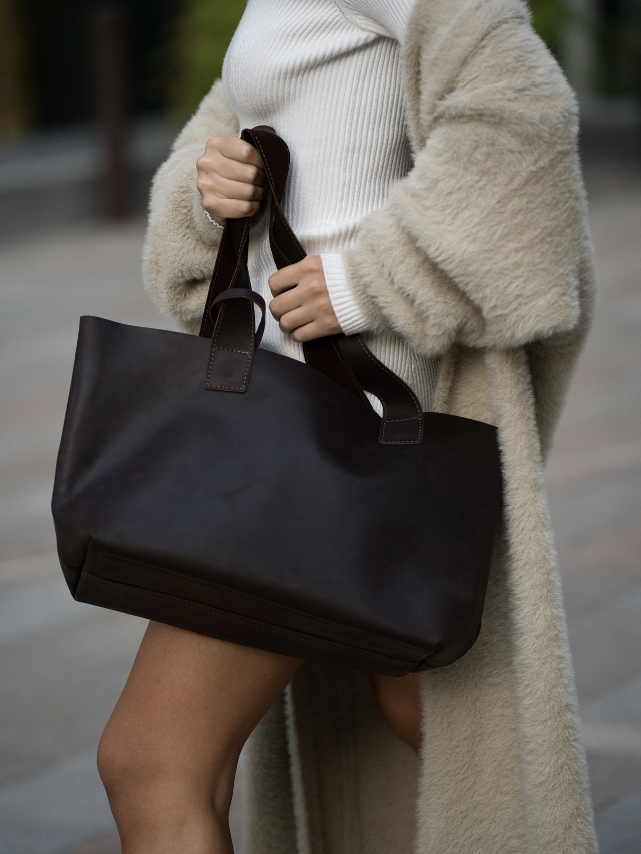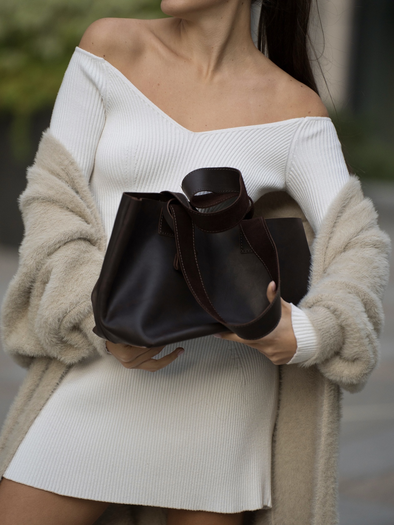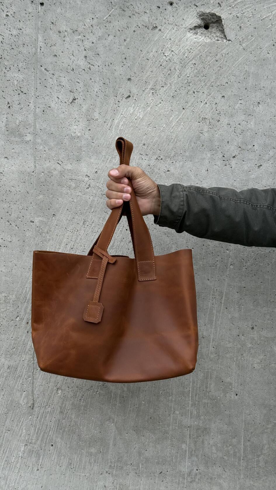 Минималистичная компактная кожаная сумка шоппер через плечо.
