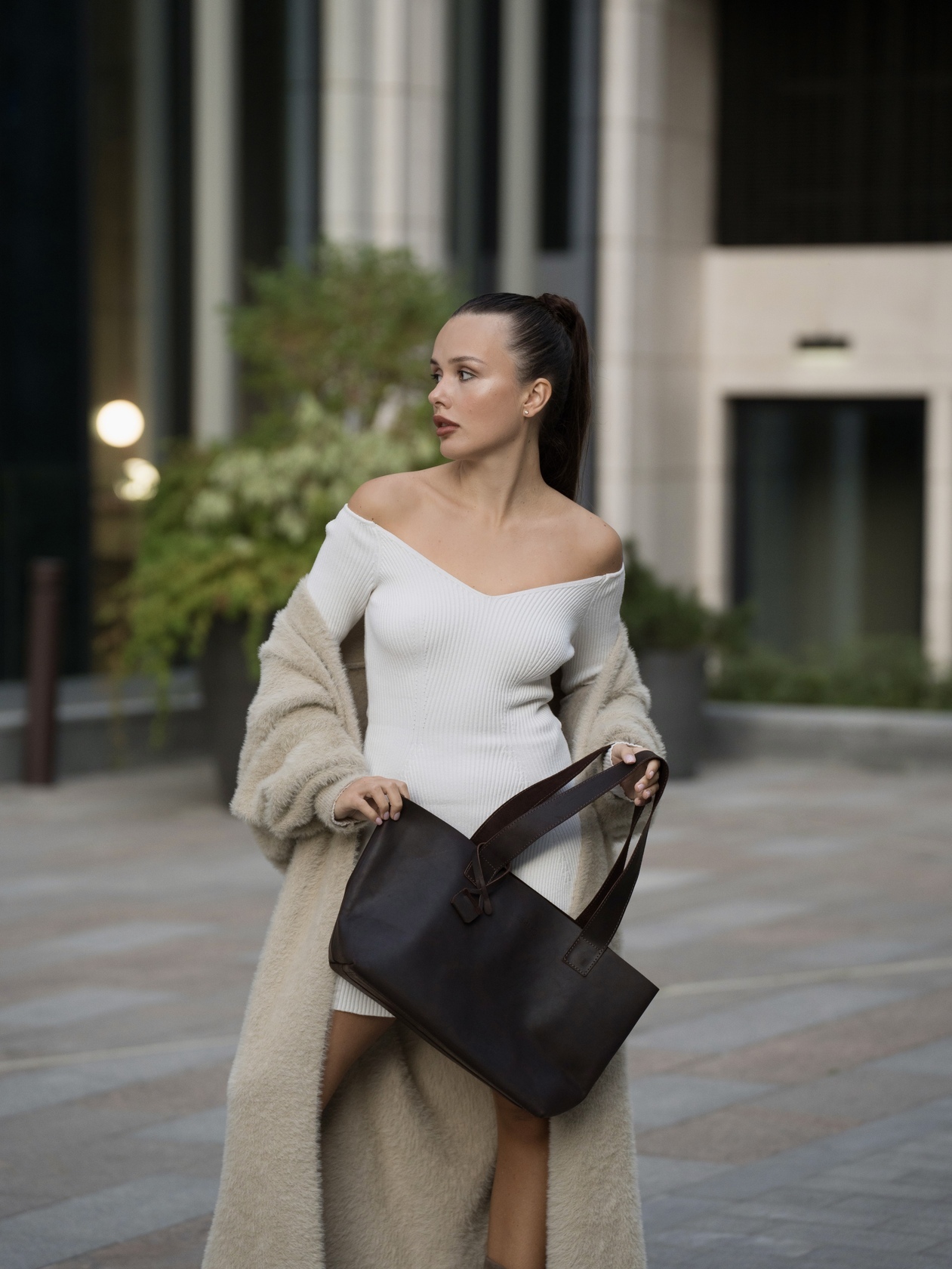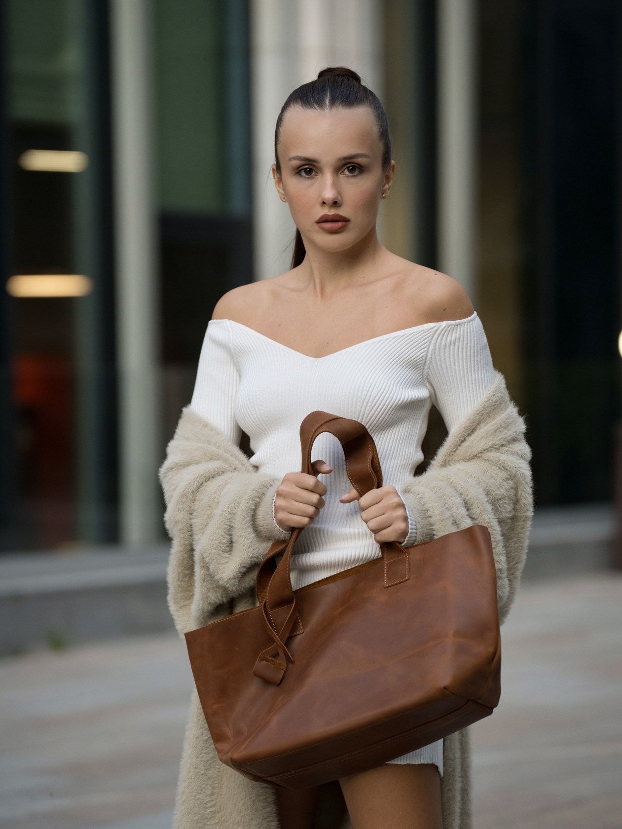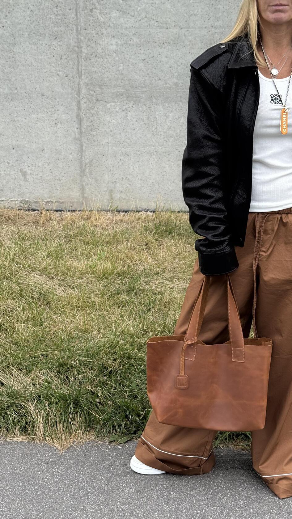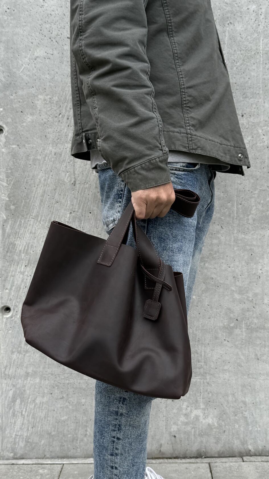 Минималистичная компактная кожаная сумка шоппер через плечо.