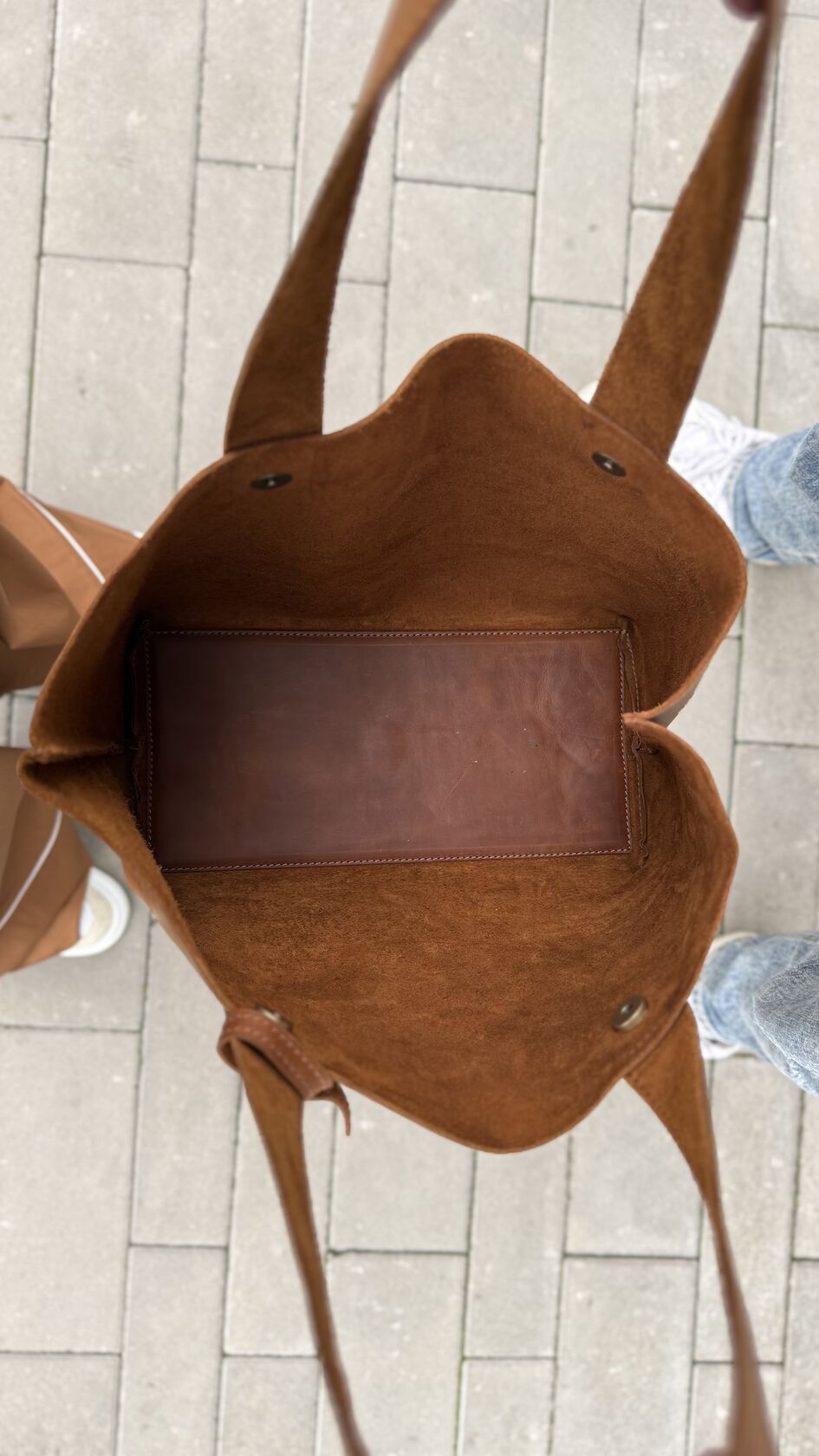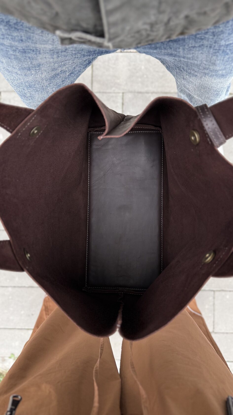 Дно выполнено из 2х слоёв кожи с упругой вставкой посередине - хорошо держит форму, не провисает.